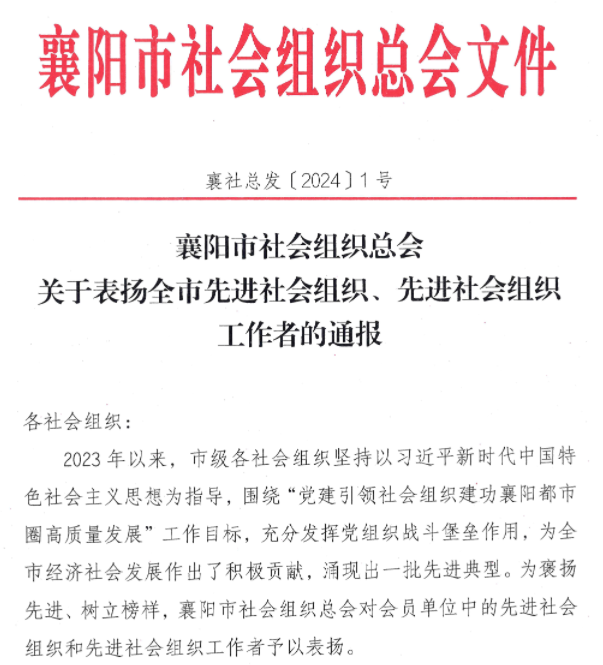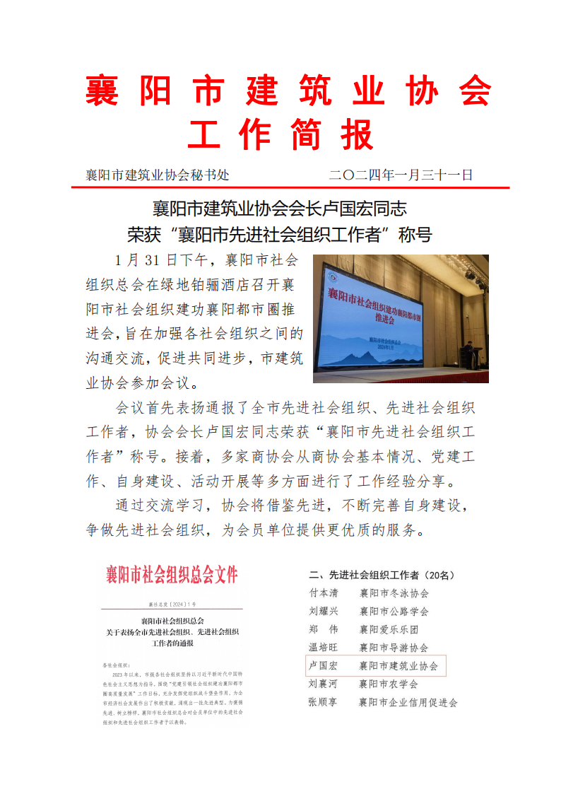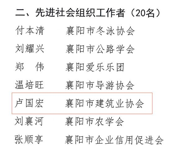 襄陽市建筑業協會會長盧國宏同志 榮獲“襄陽市先進社會組織工作者”稱號