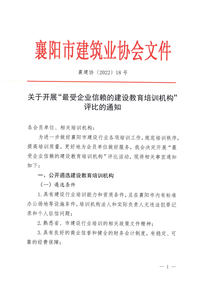 附件1:襄建協〔2022〕18號 關于開展“最受企業信賴的建設教育培訓機構”評比的通知.pdf