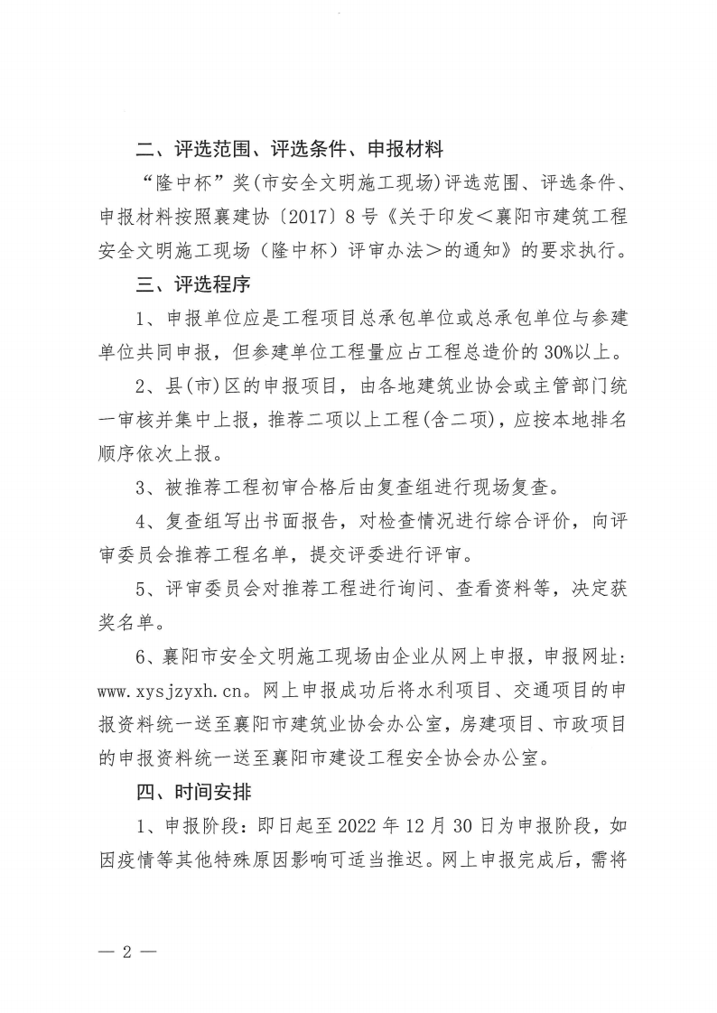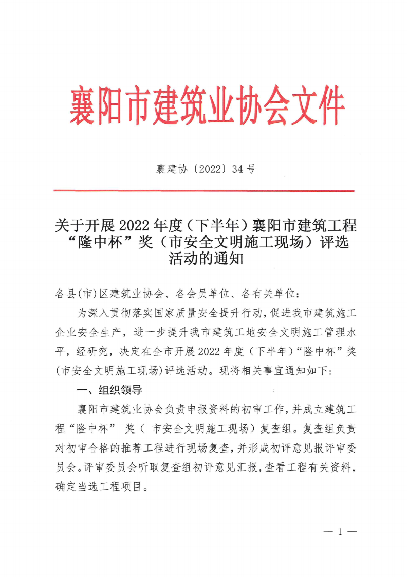 關(guān)于開展2022年度(下半年)襄陽(yáng)市建筑工程“隆中杯”獎(jiǎng)(市安全文明施工現(xiàn)場(chǎng))評(píng)選活動(dòng)的通知