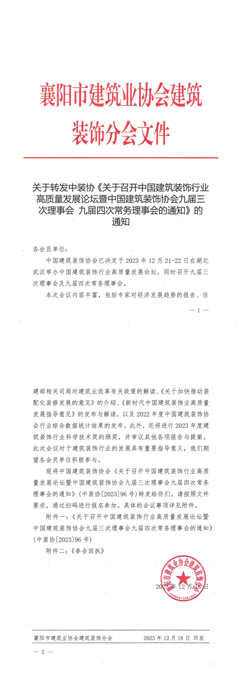 附件一:《關(guān)于召開中國建筑裝飾行業(yè)高質(zhì)量發(fā)展論壇暨 中國建筑裝飾協(xié)會(huì)九屆三次理事會(huì)九屆四次常務(wù)理事會(huì)的通知》 (中裝協(xié)[2023]96號(hào))