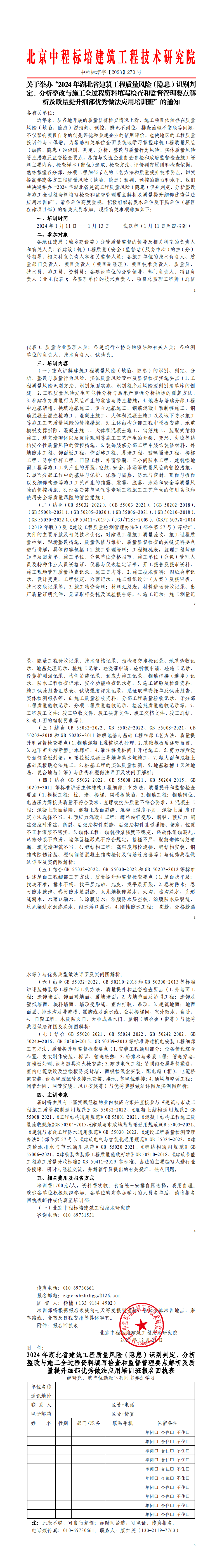 轉發北京中程標培建筑工程技術研究院關于舉辦“2024 年湖北省建筑工程質量風險(隱患)識別判定、分析整改與施工全過程資料填寫檢查和監督管理要點解析及質量提升細部優秀做法應用培訓班”的通知