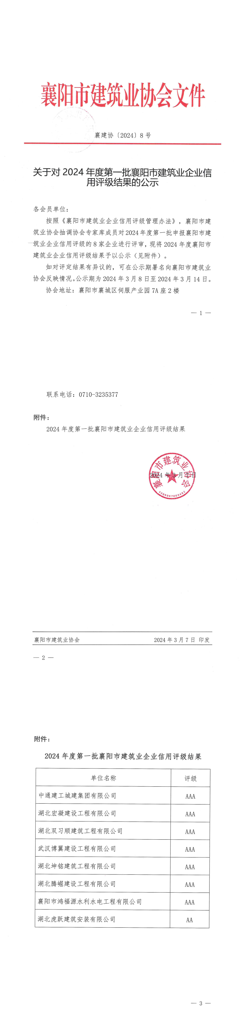 關于對2024年度第一批襄陽市建筑業企業信用評級結果的公示