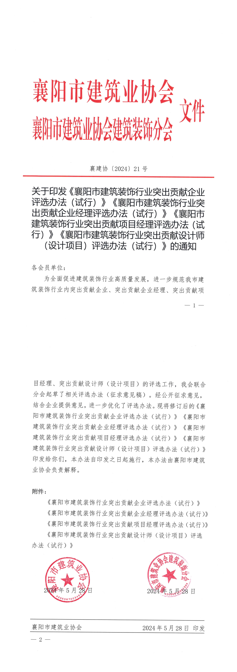 關于印發《襄陽市建筑裝飾行業突出貢獻企業評選辦法(試行)》《襄陽市建筑裝飾行業突出貢獻企業經理評選辦法(試行)》《襄陽市建筑裝飾行業突出貢獻項目經理評選辦法(試行)》《襄陽市建筑裝飾行業突出貢獻設計師(設計項目)評選辦法(試行)》的通知