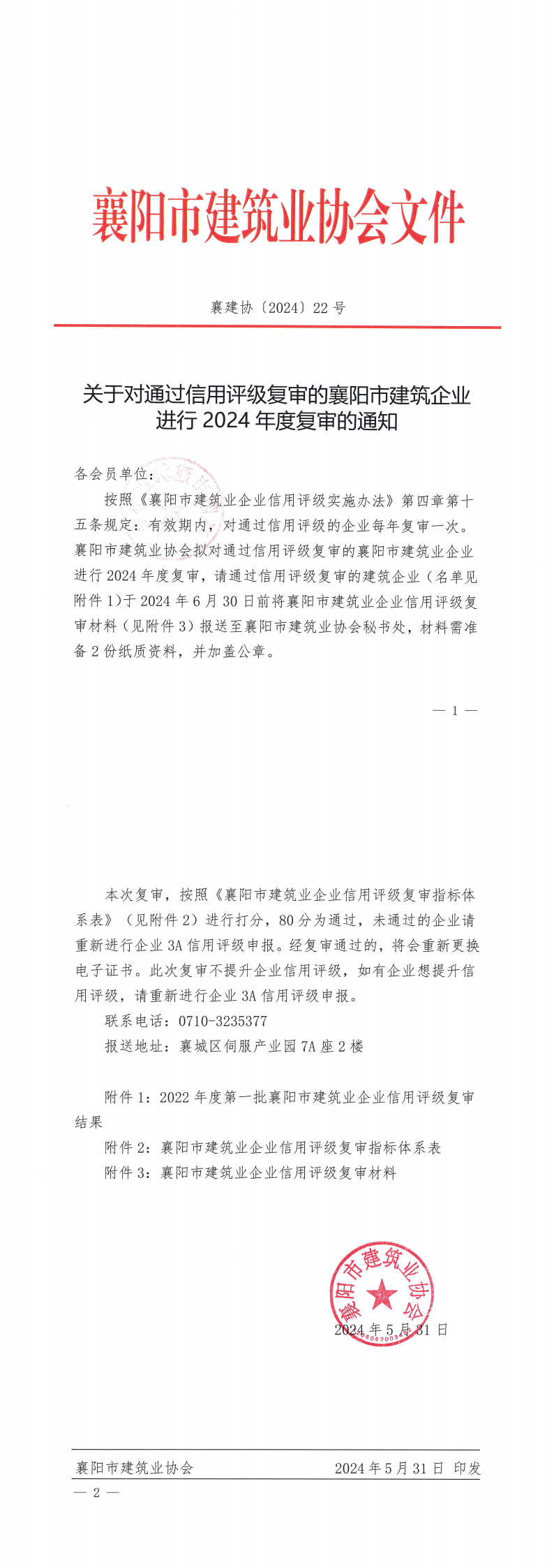 關于對通過信用評級復審的襄陽市建筑企業進行2024年度復審的通知