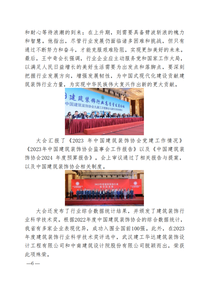 大會還發布了行業綜合數據統計結果,并頒發了建筑裝飾行業科學技術獎。根據2022年度中國建筑裝飾協會的綜合數據統計,我省有多家企業表現優異,成功入圍全國前100強。此外,在2023年度建筑裝飾行業科學技術獎評選中,武漢建工華達建筑裝飾設計工程有限公司和中南建筑設計院股份有限公司脫穎而出,榮獲此項殊榮。