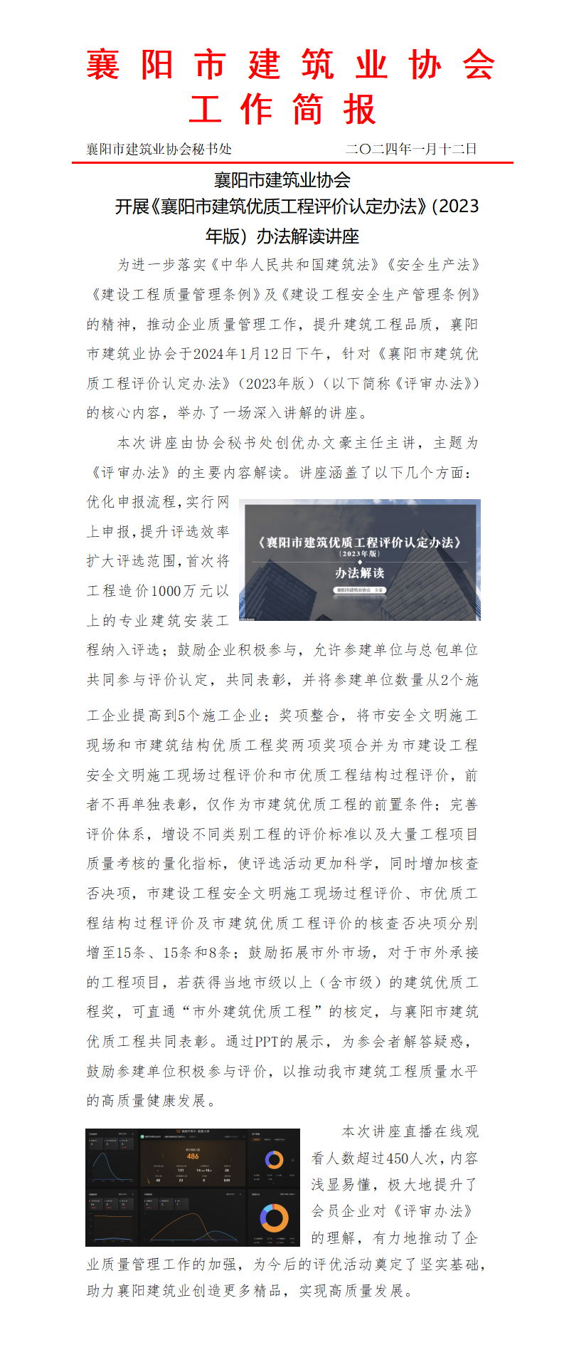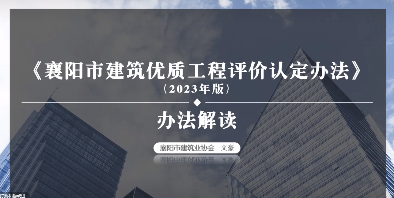 為進一步落實《中華人民共和國建筑法》《安全生產(chǎn)法》《建設工程質(zhì)量管理條例》及《建設工程安全生產(chǎn)管理條例》的精神,推動企業(yè)質(zhì)量管理工作,提升建筑工程品質(zhì),襄陽市建筑業(yè)協(xié)會于2024年1月12日下午,針對《襄陽市建筑優(yōu)質(zhì)工程評價認定辦法》(2023年版)(以下簡稱《評審辦法》)的核心內(nèi)容,舉辦了一場深入講解的講座。