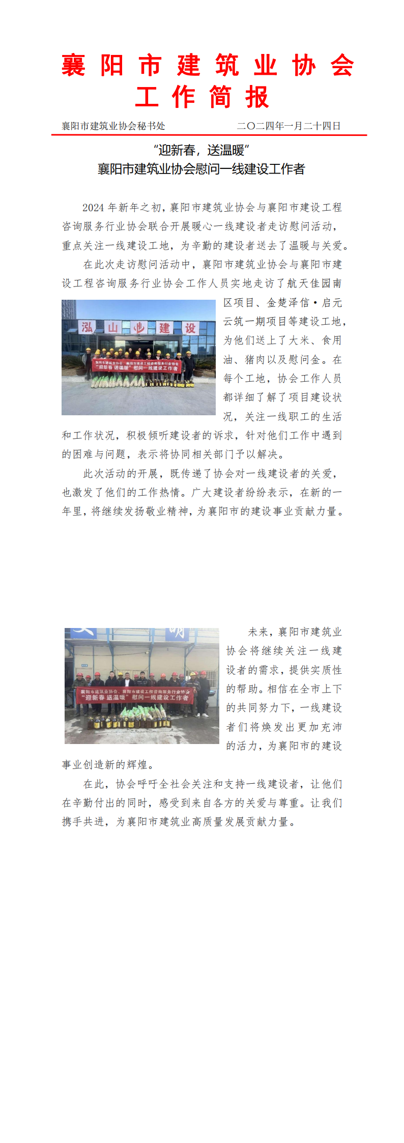 2024年新年之初,襄陽(yáng)市建筑業(yè)協(xié)會(huì)與襄陽(yáng)市建設(shè)工程咨詢服務(wù)行業(yè)協(xié)會(huì)聯(lián)合開展暖心一線建設(shè)者走訪慰問活動(dòng),重點(diǎn)關(guān)注一線建設(shè)工地,為辛勤的建設(shè)者送去了溫暖與關(guān)愛。