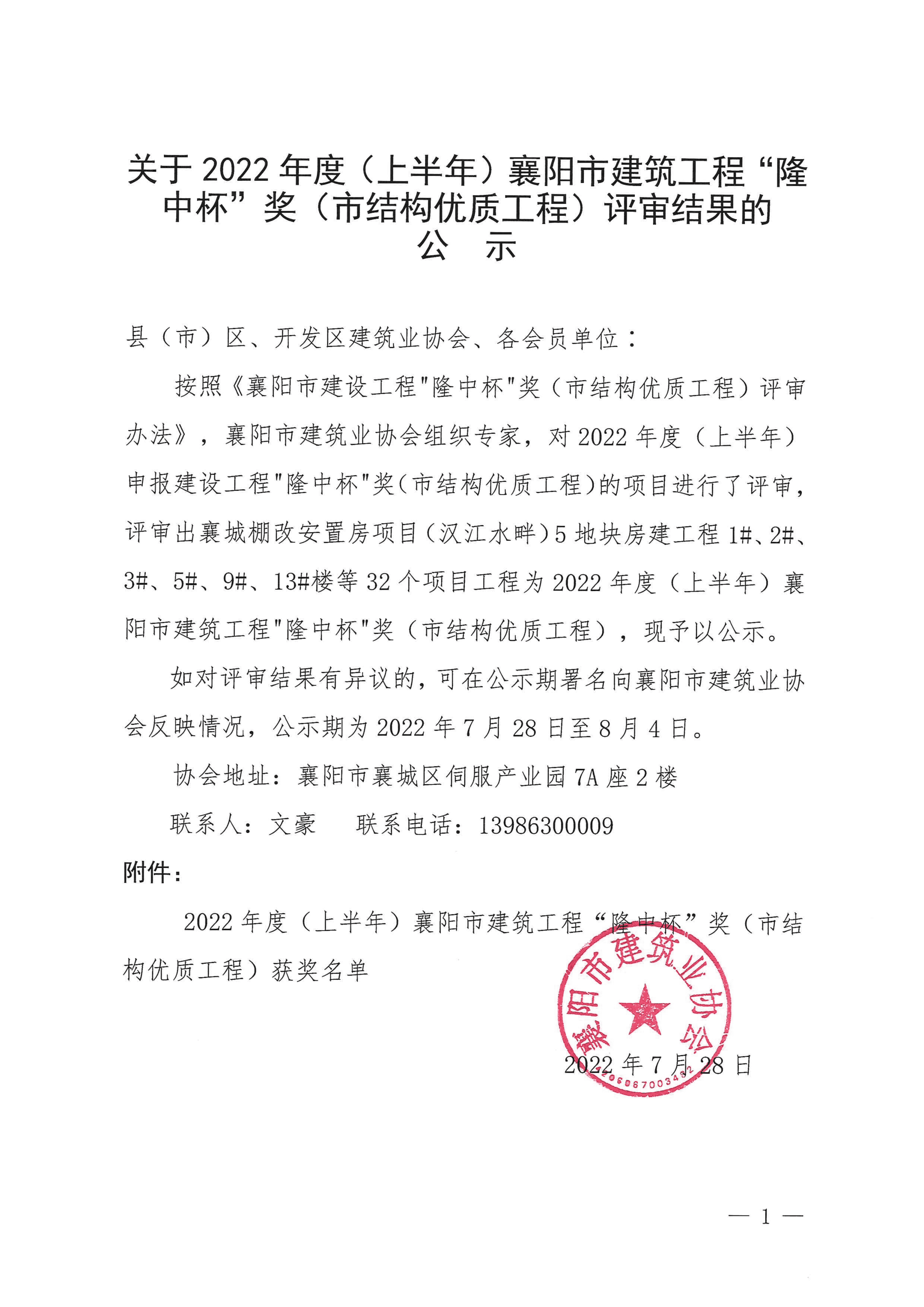 關于2022年度(上半年)襄陽市建筑工程“隆中杯”獎(市安全文明施工現場)評審結果的公示.pdf 【查看全文】